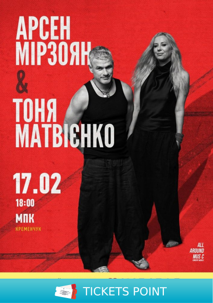 Квитки на Арсен Мірзоян та Тоня Матвієнко. Вперше разом!. Кременчук, Міський Палац Культури - 17 Лютого. Концерти купити онлайн на ticketspoint.com.ua