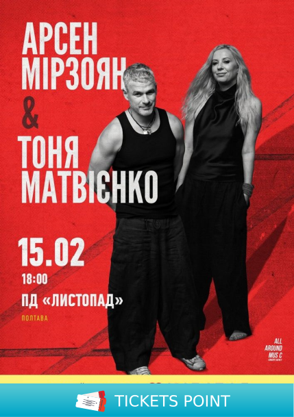 Квитки на Арсен Мірзоян та Тоня Матвієнко. Вперше разом!. Полтава, Палац дозвілля «Листопад» - 15 Лютого. Концерти купити онлайн на ticketspoint.com.ua